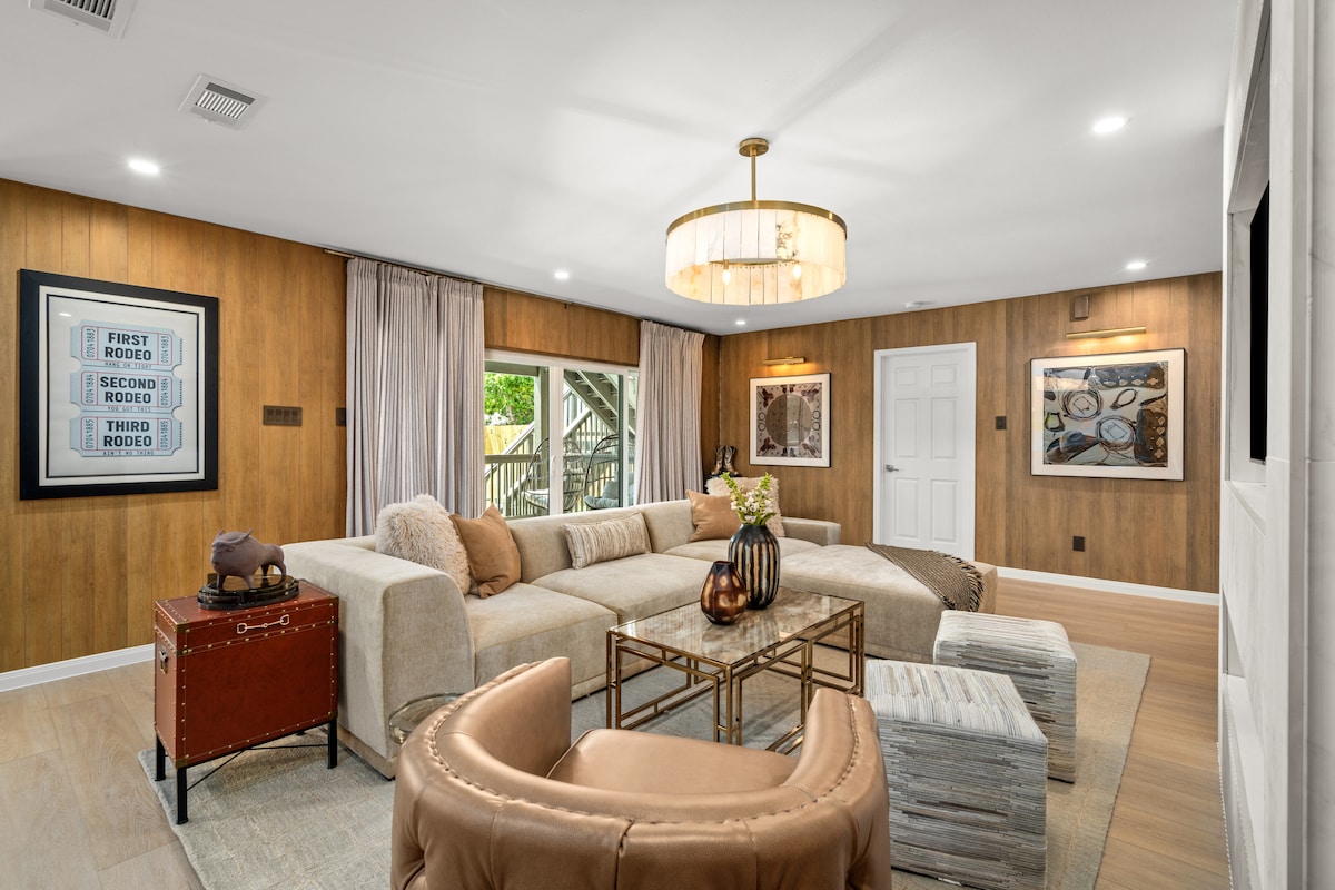 Kick back and relax in this fun, stylish space. The lights and clouds transform the space at night. Plenty of picture opportunity’s throughout the space. Watch a movie in the Gucci Theater. Make a gourmet meal in the kitchen. Relax on the patio in rocking chairs underneath the string lights, while listening to the waterfall from the pool. Unwind from the day in the King Size pillow top bed.