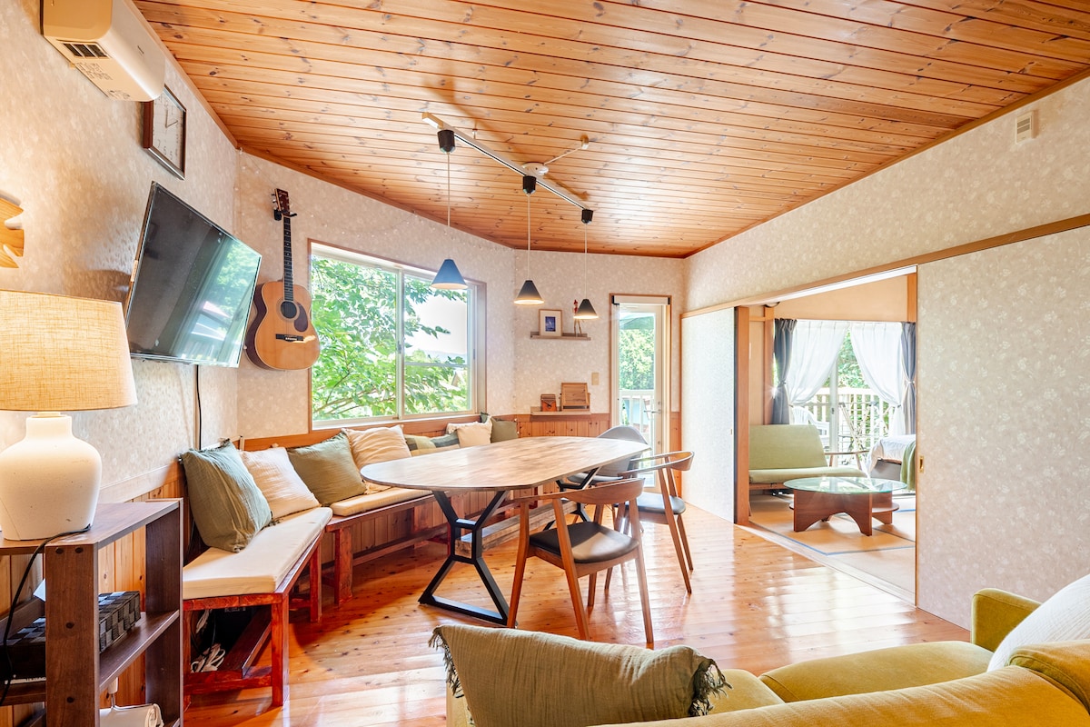 To je samostojna hiša, obdana z zelenjem ob vznožju gore Fuji.Na voljo sta 2 sobi s 6 tatami preprogami.Pozimi je na voljo Kotatsu.Na voljo imamo vse, kar potrebujete, kot so brezplačen Wi-Fi, delovna površina, hladilnik, stranišče, kad, žar itd.Na voljo sta dve klimatski napravi, da bo vaše bivanje udobno.Na voljo sta tudi žar in ognjišče, tako da se lahko sprostite in občutite naravo. Na Airbnbju oddajamo ryokan, imamo pa tudi prenočišče v ločeni stavbi, tako da se lahko odzovemo na različne načine. Oktobra 2024 so bile prenovljene straniščne školjke, kopalne kadi in tatami preproge. Kolesa izposojamo brezplačno. * Če uporabljate žar ali kres, se vnaprej obrnite na nas.Kot strošek uporabe vam bomo zaračunali 1000 jenov/osebo (gotovina na dan).Na voljo so vse osnovne stvari, kot so mreža, železna plošča, oglje, kresni les, sredstvo za vžig, tuljava proti komarjem, krožniki, palčke, rokavice, klešče, lopatica, začimbe itd.Pripravite samo sestavine.Terasa ima streho, tako da lahko pečete na žaru tudi v deževnem vremenu. * Hišni ljubljenčki so dovoljeni za majhne in srednje velike pse.2000 ¥/noč.Obstajajo kletke itd. * Zaradi zakona o obtoku plastičnih virov nimamo zobnih ščetk za enkratno uporabo.Pripravite zobno ščetko.