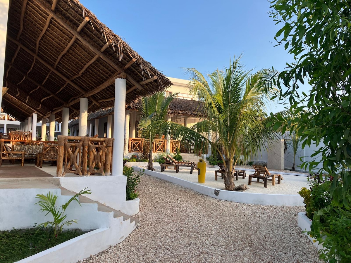 Obiščite nas in uživajte v nepozabnem razgledu na sončni zahod nad eno najboljših plaž na Zanzibarju, z naših prostornih balkonov, medtem ko uživate v morskem vetriču iz Indijskega oceana. Med bivanjem pri nas boste uživali v hotelski opremi (mešanici svahilijske tradicije in sodobnosti), vrtu, gostoljubnem osebju in svahilijski kuhinji. Prostorna in brezhibna bela peščena plaža se nahaja le 5 minut hoje od hotela, kjer se lahko sprostite, plavate, sončite, družite in uživate v rekreacijskih dejavnostih na prostem.