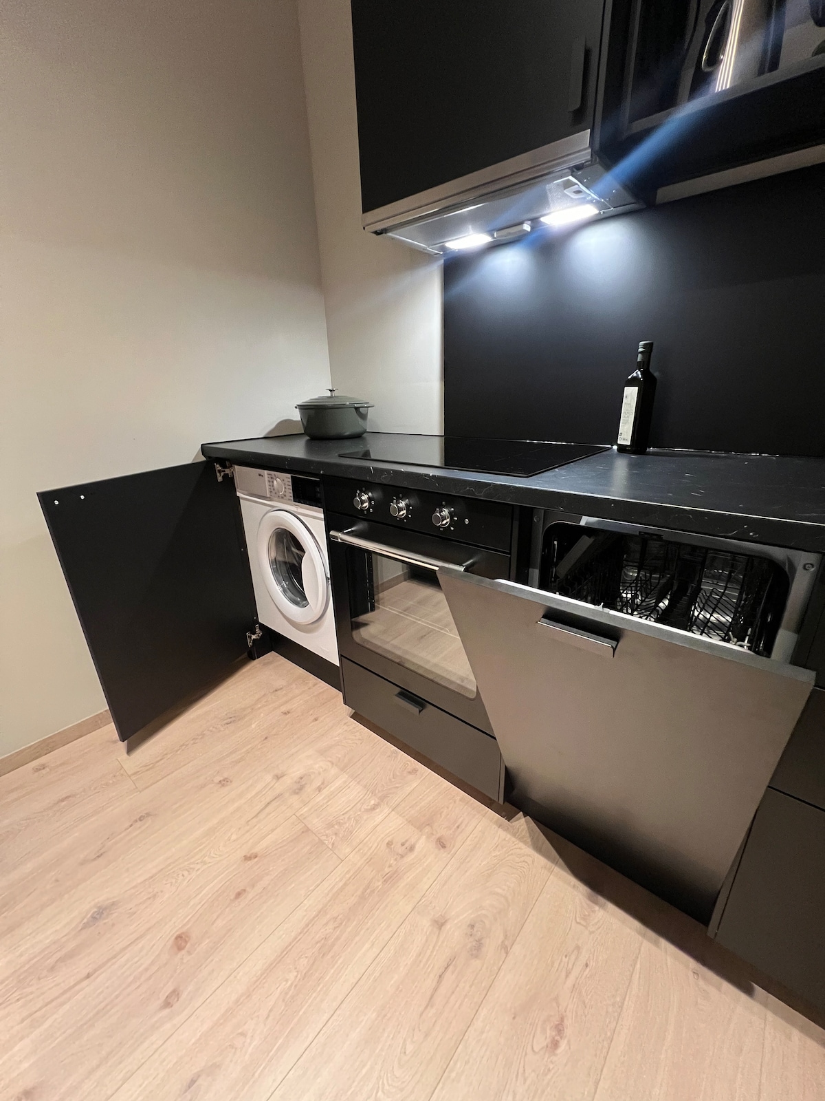 Popoln romantični oddih na Norveškem Zaščitena koča, obrnjena proti jugozahodu, obdana z zimzelenimi drevesi, ki ustvarjajo intimno okolje. Notranjost v temni barvni shemi, sproščena kot dolge zimske noči. Uživajte v zasebni gozdni masažni kadi za 500 NOK na bivanje, rezervirajte vnaprej. Okna od tal do stropa z zatemnitvenimi zavesami in talnim ogrevanjem. Zakonska postelja, kuhinjska niša s kuhalno ploščo z dvema ploščama, visokokakovostni jedilni pribor, udoben prostor za sedenje. Kopalnica z deževno prho, umivalnikom in straniščem.