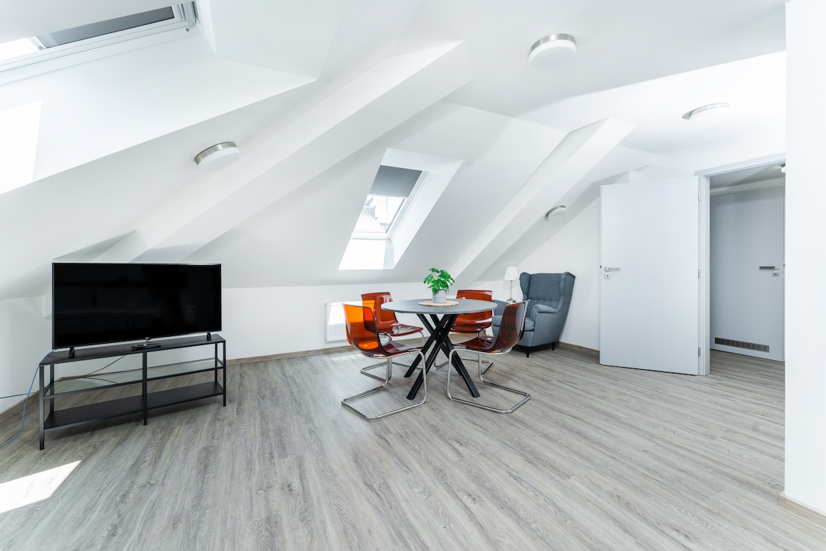 Street: Čechova 114: Apartment # 58 „Paris“ 39 m2 on the top floor of a new building with a balcony. Closed VIP floor with chip lift, 100% security, service and comfort. Air conditioning, full equipment incl. dishes and towels. 300 meters from the center - Poděbrady colonnade, 2 minutes from the railway and bus station - 55 minutes to the center of Prague. Internet 350 Mbit Up & Down without limits !!! WiFi full coverage. 4K 55''TV. Washer & dryer, dishwasher, fridge / freezer, microwave.