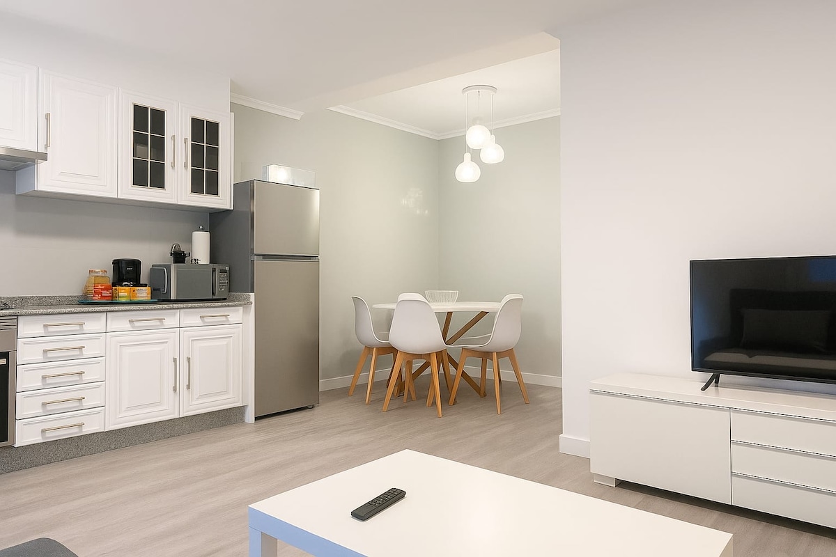 Tla imajo: • 1 spalnica s posteljo, ki meri 135 cm • kopalnica z WC-jem v spalnici • dnevna jedilnica • kuhinja, opremljena s Pequrño Idealno za par, vendar sta na voljo raztegljiv kavč in otroška stvar. Stanovanje se nahaja v mestnem središču, v mirnem predelu. Vse je blizu: glavna ulica, pristanišče, promenada. Na voljo so brisače, rjuhe, odeje, ventilator, radiator, sušilni stroj, likalnik, aparat za kavo, omarica z zdravili, gasilni aparat, kuhinjski pripomočki, olje, kava, sol, voda, gel, toaletni papir...