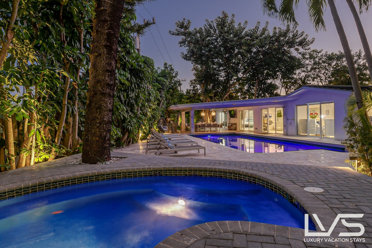 Pobegnite v to čudovito zasnovano prenočišče s 3 spalnicami in 3 kopalnicami na eni najbolj zaželenih lokacij v Fort Lauderdaleu. Čudovit oddih 3BR/3BA v East Fort Lauderdaleu, le 0,5 milje od zasebne plaže. Uživajte v visokih stropih, odprtih bivalnih prostorih in razgledu na vrt. Sprostite se na ograjenem tropskem dvorišču z ogrevanim bazenom, spa centrom in masažno kadjo. Blizu najboljših restavracij, trgovin, Port Evergladesa in kongresnega centra - kot nalašč za družine, pare ali profesionalce, ki iščejo elegantno obalno zatočišče.