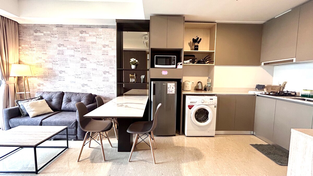 Popolnoma novo edinstveno bivališče, kjer se lahko sprostite fizično in duševno. Ima 1 spalnico in 1 kopalnico. Sprejme lahko 4 osebe. Ima 1 veliko zakonsko posteljo in zložljiv raztegljiv kavč za 1-2 osebi. Uživate lahko v čudovitem razgledu na morje. Zelo čisto in urejeno. Pred prihodom bomo zamenjali rjuhe in brisače ter jih razkužili, vključno s tlemi. Pik je v bližini nakupovalnega središča pik Ave in je zdaj priljubljena destinacija v Džakarti.