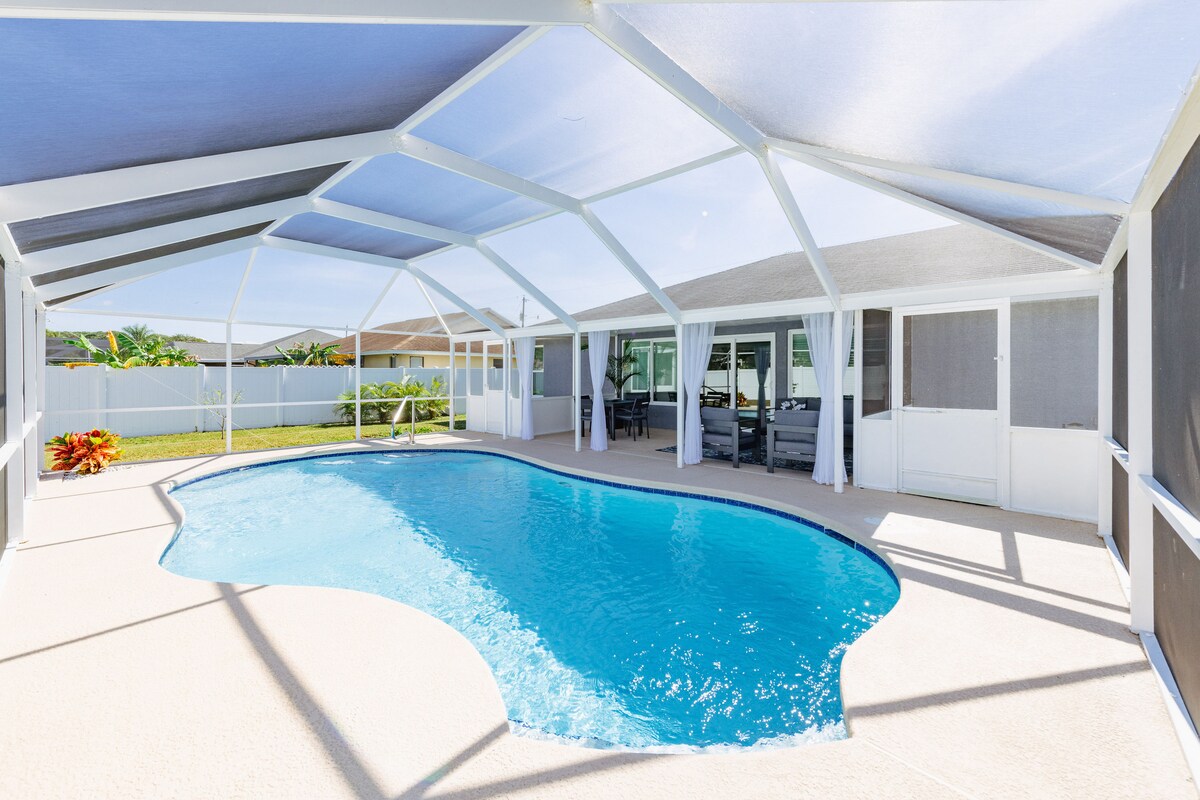 Welcome to The Palm — a fire pit oasis near Jensen Beach. Unwind in the private backyard, relax in the screened patio with smart TV and hanging chairs, or cook in the fully stocked modern kitchen. Just minutes from Jensen Beach, Stuart Beach, and historic downtown Stuart, this home is perfect for families, couples, and remote workers. Enjoy fast Wi-Fi, memory-foam beds, and kid-friendly extras like a pack & play and changing station.