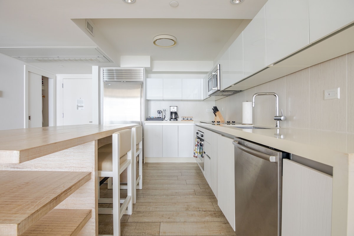Prebudite se ob osupljivem razgledu na ocean in mesto v tem prostornem stanovanju ob plaži 2BR/3BA, ki je popolnoma opremljeno za vaše udobje. Uživajte v zasebnem balkonu, kuhinji in pralnici v enoti. Pojdite z dvigalom in že ste na pesku. Dostop do bazena, telovadnice in restavracije v sklopu hotela. Idealno za družine, pare ali delo na daljavo. Stil, udobje in neverjetna lokacija v osrčju Sunny Isles Beacha.