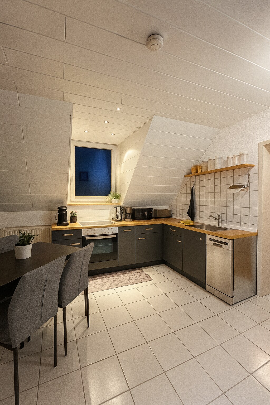 Dobrodošli v svojem začasnem domu. Naše svetlo podstrešno stanovanje z velikim balkonom združuje udobje in sodobno zasnovo. Ne glede na to, ali gre za počitnice ali poslovno potovanje, se lahko tukaj takoj počutite kot doma. Sodobna kuhinja vas vabi, da skupaj kuhate, na balkonu pa uživate v kavi, soncu in sprostitvi. Zabava za vse starosti vas čaka za mizo za namizni nogomet. Odprti prostori, veliko svetlobe in prijetno vzdušje naredijo stanovanje posebno. Sprejme lahko največ 4 odrasle osebe in 1 malčka.