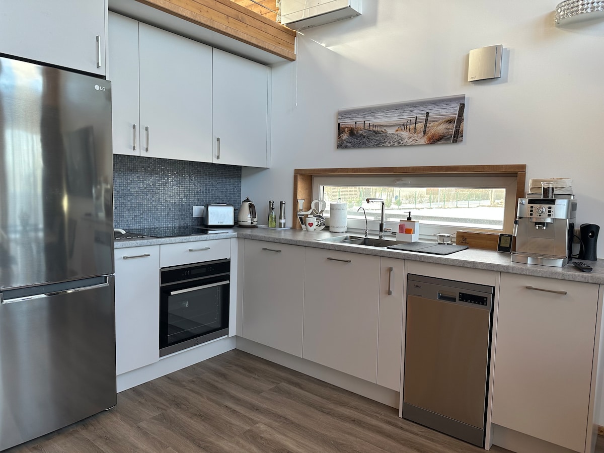 A fully equipped kitchen, two double beds, a bathroom, and a dining table. You will find a TV, free WIFI, air-conditioning, and a garderobe here. Included: • Bathrobes, towels, and slippers • Heated swimming pool (seasonal) • Private beach on the Daugava River • Grill zone (bring your charcoal and liquid) • Playground • Free Parking For extra payment: • Jacuzzi (50€)* apply at least one day before arrival • Sauna (50€) • Padel Tennis (20€) Please message us to add extras.