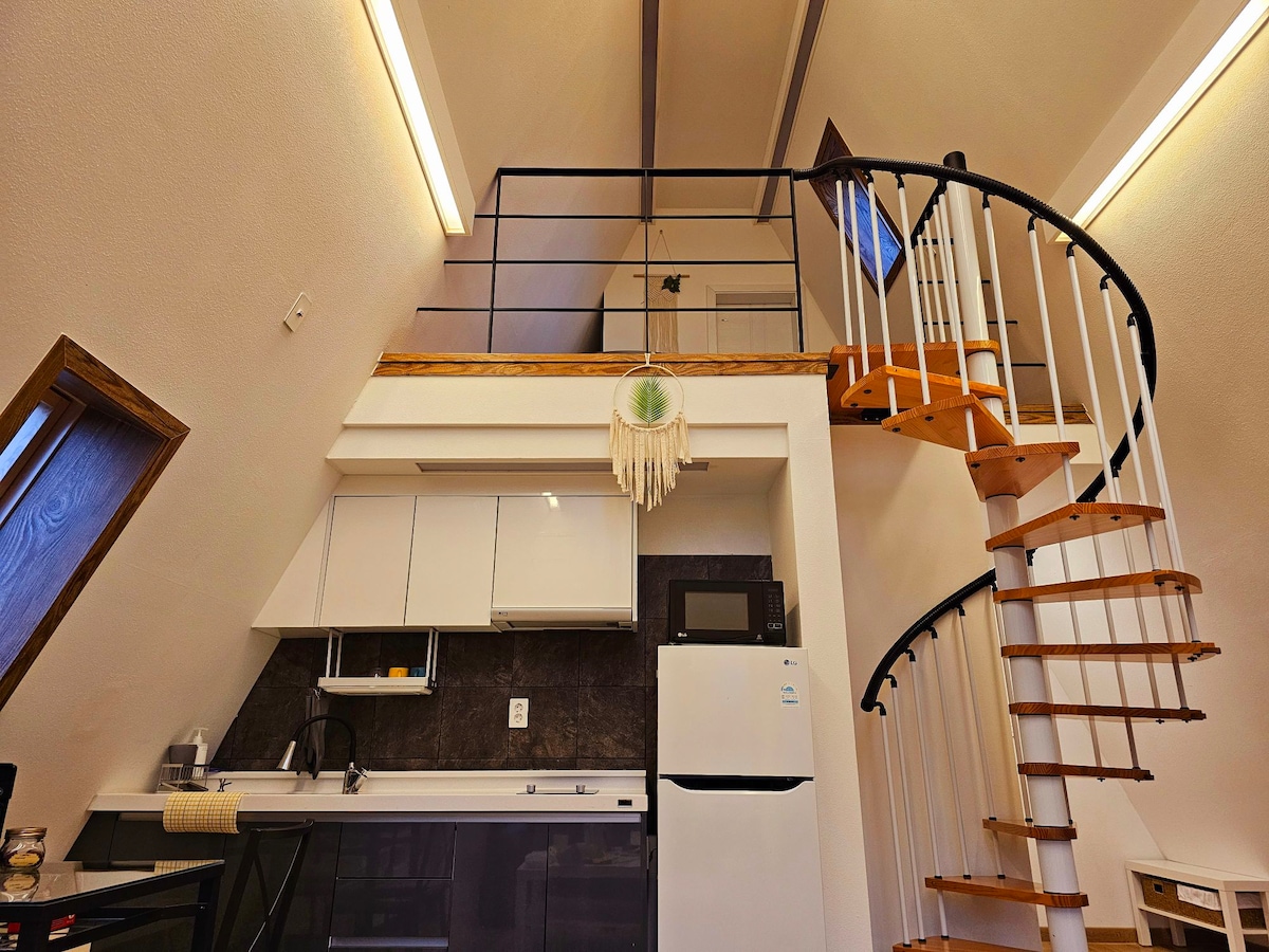To je majhna nova stavba v mirnem stanovanjskem predelu, 5 minut od postaje Gangneung.Moja glavna je bila notranja ureditev, zato me je zanimala arhitektura.V romantični hiši sem videl tako dolgoletno željo. Sodobna in zabavna dupleksna stavba, zgrajena s kombinacijo belih tonov in lesa, od katerih ima vsaka svojo kopalnico v prvem in drugem nadstropju, in je usmerila na zasnovo, da bo svetloba in vetrič delovala, medtem ko je popolnoma blokirana od zunaj. Pogled iz drugega nadstropja, sončna svetloba in veter so eksotični in posebni, zato je tiho. Razcvet na majhnem vrtu v prvem nadstropju je v cvetju. Mislim, da lahko za nekaj časa pozabite na svoje vsakdanje življenje in se sprostite.