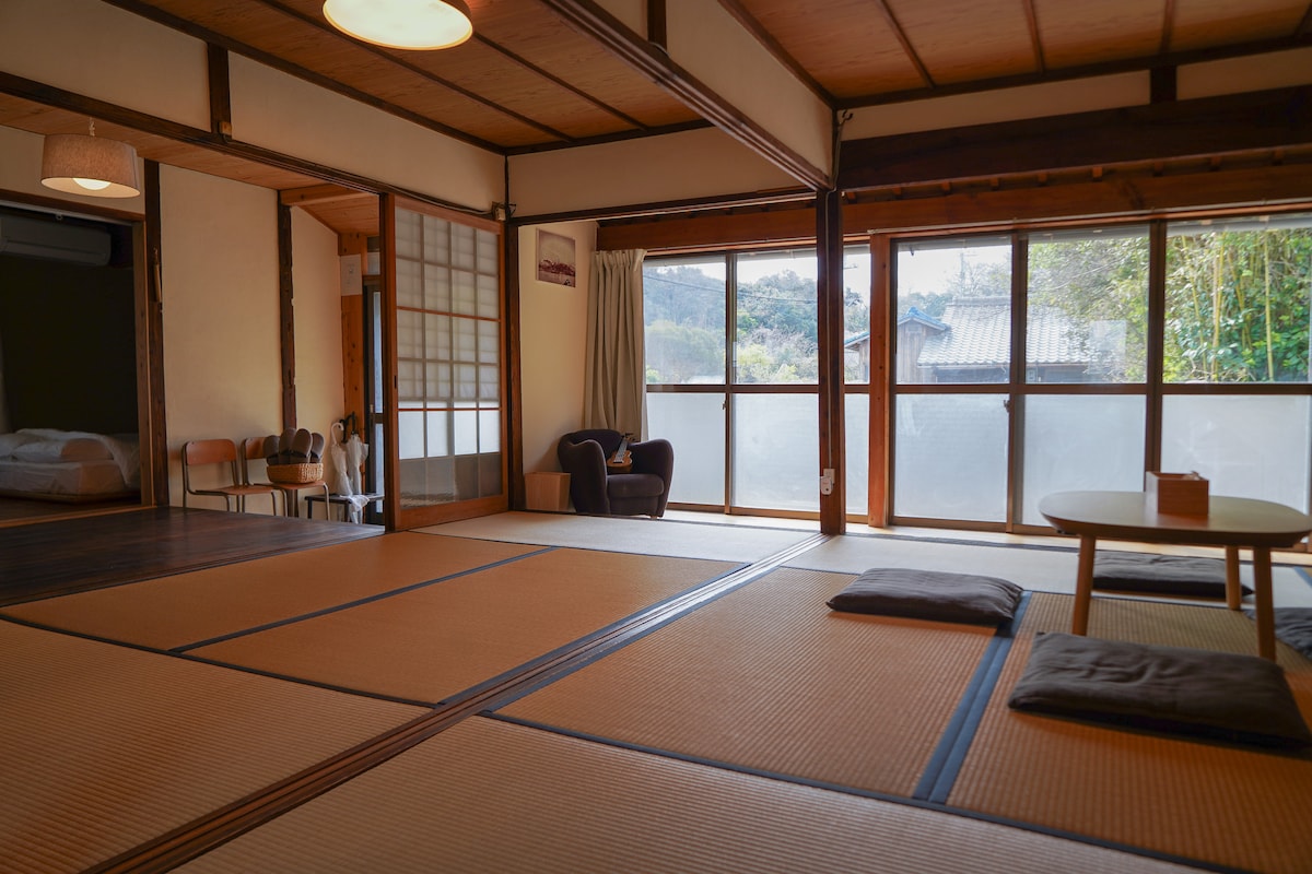 Zlasti smo prenovili staro zasebno hišo, zgrajeno pred približno 80 leti v Teshimi (Teshima), prefekturi Kagawa, poleti 2021 pa smo začeli s poslovanjem. Stara hiša s prostornim prostorom v prostorni namestitvi nad nenavadnim Ishigakijem, lahko uživate v vzdušju mirnega dvorca.Uživajte v razkošni arhitekturi tistega časa, kot so valovita steklena okna in zelo velike luči po starem načinu izdelave. Nahaja se na priročni lokaciji, približno 10 minut hoje od pristanišča Toshima Ieura, na hribu s panoramskim razgledom na celotno idilično vasico, za njo pa se širi mirna pokrajina Seto Inland Sea.Poleg tega se lahko na sončen dan sprostite in opazujete vzpon lune z zvezd in zadnje gore. Stavba je sestavljena iz »glavne stavbe« in »aneksa«, kot ukrep proti nalezljivim boleznim pa bomo sprejeli po en par stavb v vsaki stavbi.Poskrbimo, da boste lahko brezskrbno bivali pri svoji družini. Za stavbo so polja in bogata Satoyama, na voljo pa so tudi koze.Priporočljivo je tudi za sprehod po ribniku in zapletenih ulicah v vasi, pa tudi za tišino v bližini.Poleg tega lahko sodelujete tudi v različnih programih doživetij (ki so trenutno prekinjeni, da preprečite širjenje nalezljivih bolezni). Uživajte v otoškem času v Setouchiju.