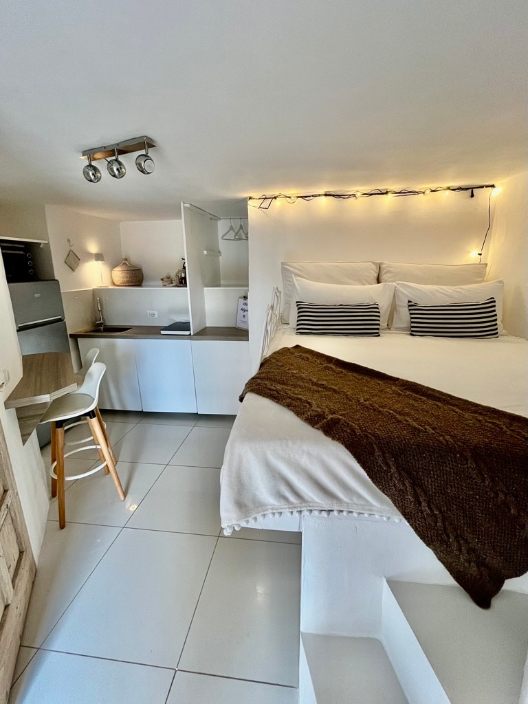 Mini camera/studio con angolo cottura e letto a soppalco presso Villa Kalypso Porto Cervo, 8 -10 minuti a piedi dalla spiaggia di Cala Granu, posto auto gratuito all'interno della struttura , Wi-Fi gratuito, Smart tv, Aria condizionata, giardino con sdraio private esterne e tavolino vista mare.