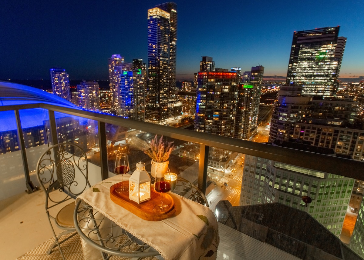 Panoramski razgled z velikim balkonom jezera Ontario, stolpom CN in obzorjem Toronta. 3 spalnice - lahko udobno spijo 6/7. 2 zakonski postelji, 1 enojna postelja in zračna vzmetnica s hitro napihljivo črpalko. Popolnoma nova zaključna. 70-palčna pametna televizija v dnevni sobi. Parkirišče je vključeno. Sprehodite se do pristaniške fronte, CN Tower, Scotiabank Arene in še marsikaj. Popolnoma opremljena kuhinja, plišaste postelje.
