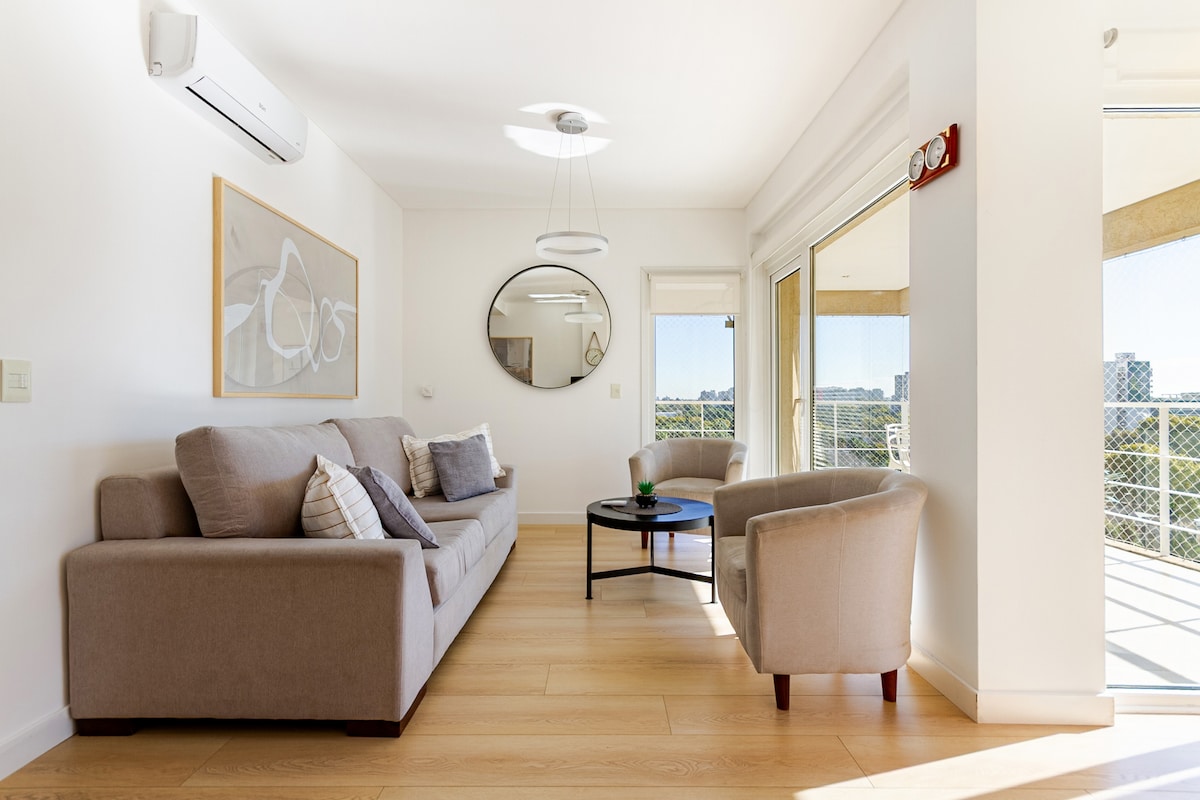 Elegantno enosobno stanovanje v prestižni soseski v Buenos Airesu. Sodobna kuhinja, ki je povezana z veliko dnevno sobo, jedilnico in balkonom. Bazen, žar in telovadnica s pogledom na reko v zgornjem nadstropju! Žar lahko rezervirate z doplačilom. Če potrebujete zasebno parkirišče, ga lahko upravljate tudi vi.