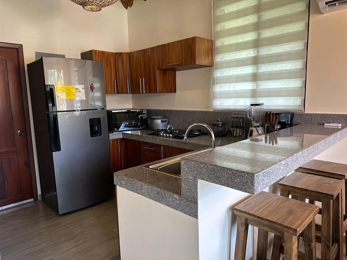 Our house offers modern amenities in a quiet, relaxing, and safe neighborhood. Enjoy beautiful green and sky views from your bed and throughout the house. The property features a spacious backyard, a comfortable patio with a hammock, a fully equipped kitchen, private parking, and peaceful surroundings. Located less than a minute by car (or 10-minute walk) from downtown Manglaralto, you’ll find grocery stores, bakeries, restaurants, and more nearby. Montañita is just five minutes away by car.