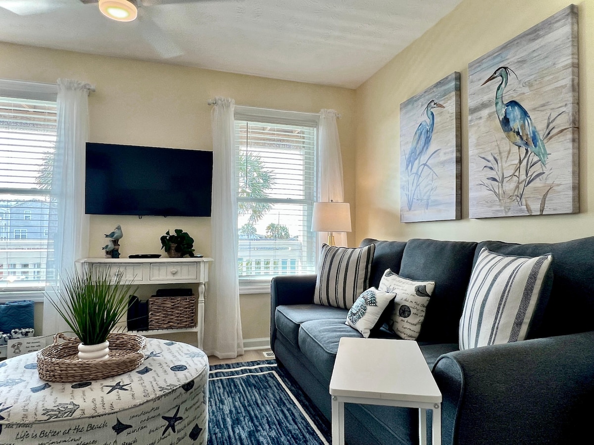 Enjoy million dollar ocean views at this third floor condo on gorgeous and peaceful North Topsail Beach. Be treated to striking sunrises and the view of dolphins playing near the shore. The Hatchling features a private balcony, 1 bedroom, bunk beds, and a full sleeper sofa. Topsail Island is the perfect place to relax and enjoy the sand, shells, and sea, with plenty of fun nearby. This “point unit” offers unobstructed views of the ocean, as well as 5g WiFi, TV/Roku and a fully equipped kitchen.