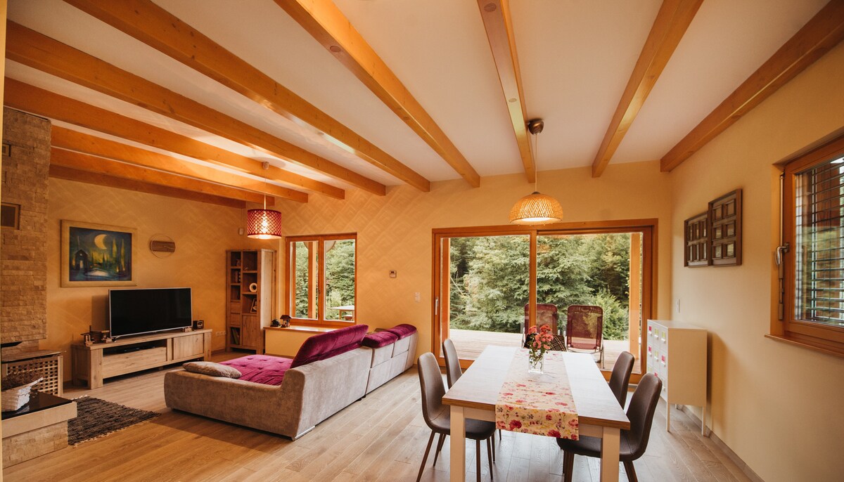 Lesena počitniška hiša v mirni vasici v bližini Zagreba na poti do morja. Idealno za družino z obilico igralnih in sprostitvenih objektov: sezonski zunanji bazen (maj - oktober), masažna kad, savna, igre za otroke in odrasle. Hiša ima 3 spalnice, 2 kopalnici, popolnoma opremljeno kuhinjo, 3 terase in pogled na gozd. Hiša se oddaja izključno za mirne počitnice.
