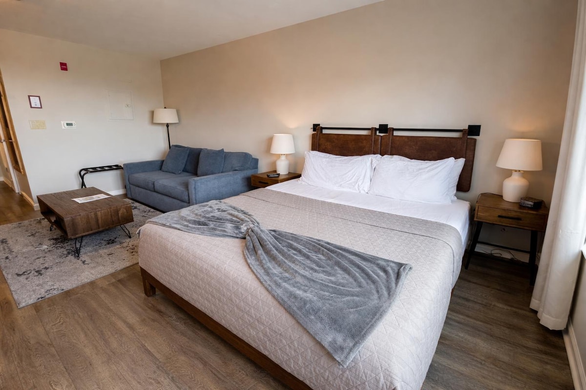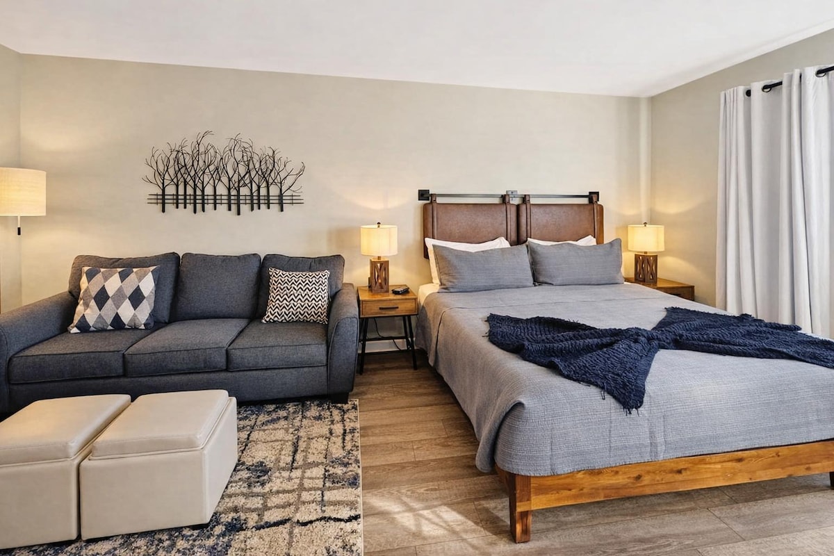 Izglasovan za novega gostitelja št. 1 v New Jerseyju! Doživite sodoben, vrhunski studio apartma v hotelu The Appalachian v kraju Mountain Creek – le 1 uro od New Yorka. Uživajte v mehki zakonski postelji, raztegljivem kavču, udobnem sodobnem kaminu, kopalnici v slogu toplic z lestencem, elegantni prhi in edinstveni dizajnerski preprogi. Stopite ven in smučajte, deskajte na snegu, kolesarite, pojdite na pohod ali pa obiščite vodni park, kmetije in vinske kleti. Sprostite se s hotelsko opremo, ki vključuje ogrevan bazen, masažno kad in omarico za smučarsko opremo. Elegantno in udobno zatočišče za vse letne čase.