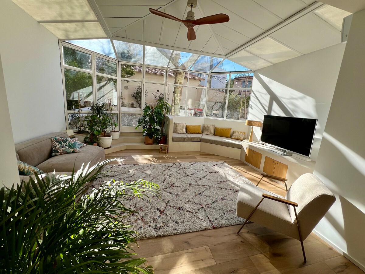 Maison individuelle dans jardin privatif (salon, salle à manger, cuisine contemporaine équipée, vue mer du séjour, deux chambres). Proches: Parc National des Calanques, plages, restaurants, bars animés, commerces, bol de skate, aire de jeux, deux beaux musées et deux parcs arborés rapidement accessibles à pied, en font un excellent lieu de vacances (avec un, voire deux postes de travail). Pistes cyclables et transports en commun très proches pour aller aux calanques, ou en centre ville.