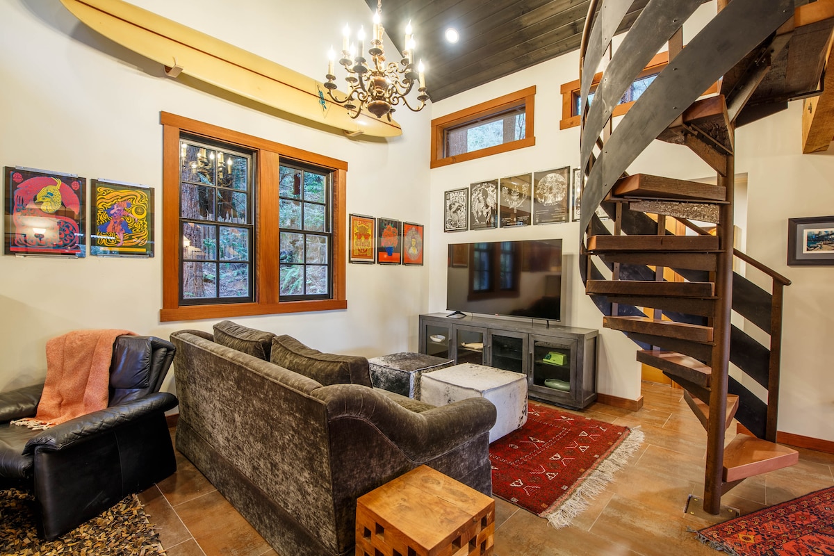 This incredible space has been the inspirational hub for designing the most creative projects in Humboldt during the past 18 years. Now it has been reborn as an immersive space to enjoy the redwoods. Every inch has been thoughtfully designed to allow our guests to feel the enveloping majestic nature of the surrounding forest. Upon arrival, a golf cart awaits for your journey through the woods, to the upper landing of the raised boardwalk crossing over a seasonal creek bringing you to The Studio.