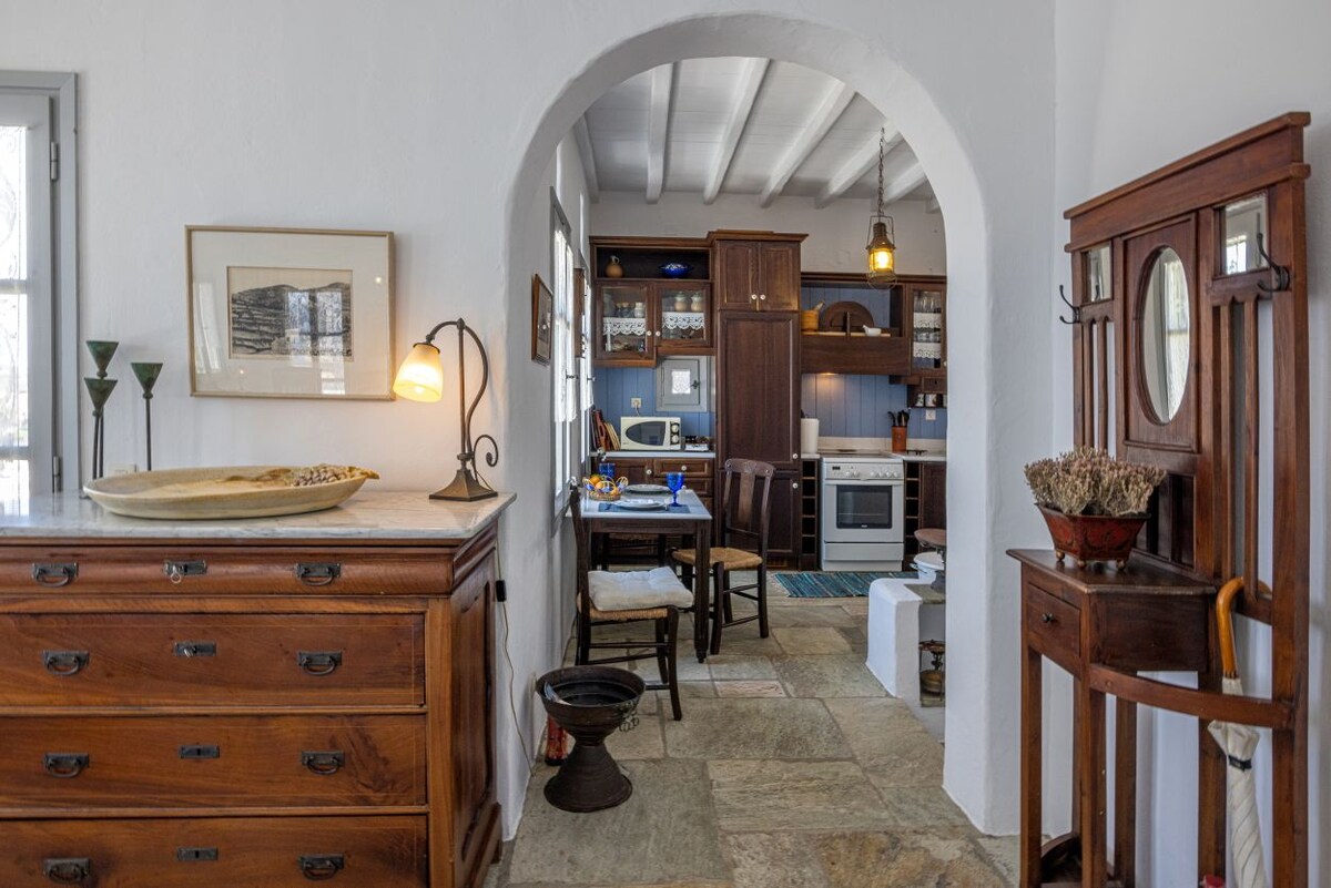 Ta okolju prijazna hiša velikosti 55 m2 se nahaja 18 minut vožnje z avtomobilom od pristanišča Tinos, na zahodni strani otoka, v oljčnem nasadu in obdana s skalnato pokrajino ter s pogledom na Egejsko morje. Ta tradicionalna kmečka hiša je bila preoblikovana v minimalnem slogu. Prostor je idealen za par, ki obožuje podeželsko življenje in zasebnost. Ponuja priložnost, da se sprostite od mestnega življenja in se ponovno povežete s preprostostjo in mirom narave ter pozornosti.