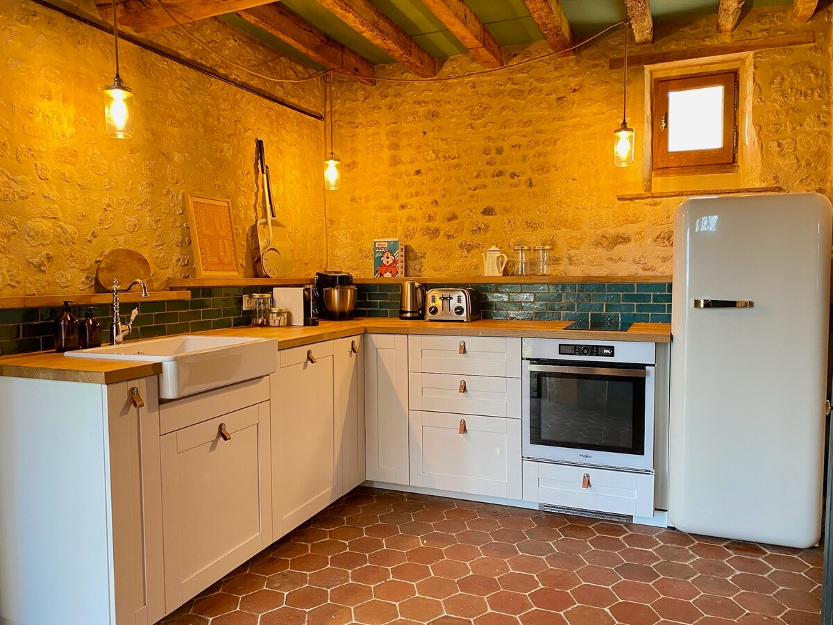 Sodobna vila v prenovljenem skednju (300 m²) v osrčju Percheja. 4 spalnice s hotelsko posteljnino, velikim bivalnim prostorom, 90-palčno televizijo, masažno kadjo, 3 stranišči. Terasa, žar, majhen bazen s pogledom na hrib. Kot nalašč za družine in prijatelje. Komplet Raclette, dirkalni simulator, masaže in zasebni kuhar so na voljo na zahtevo.