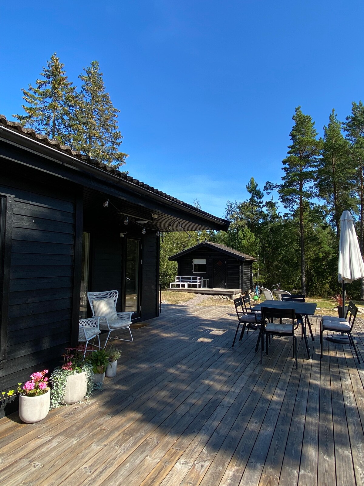 House by the sea on a jetty👍Enjoy the hot tub and wood-burning sauna. Fantastic outdoor environment. Modern and fully equipped house, tastefully decorated. Perfect experience for those who want to have a relaxing and beautiful time on the water🌞 If you want to be active: canoe, hike in the nearby national park, go for a run or go boating. All this just 30 minutes from Stockholm! Imagine spending a few days or weeks in this environment 😀 - All space is privately available to you as guests.