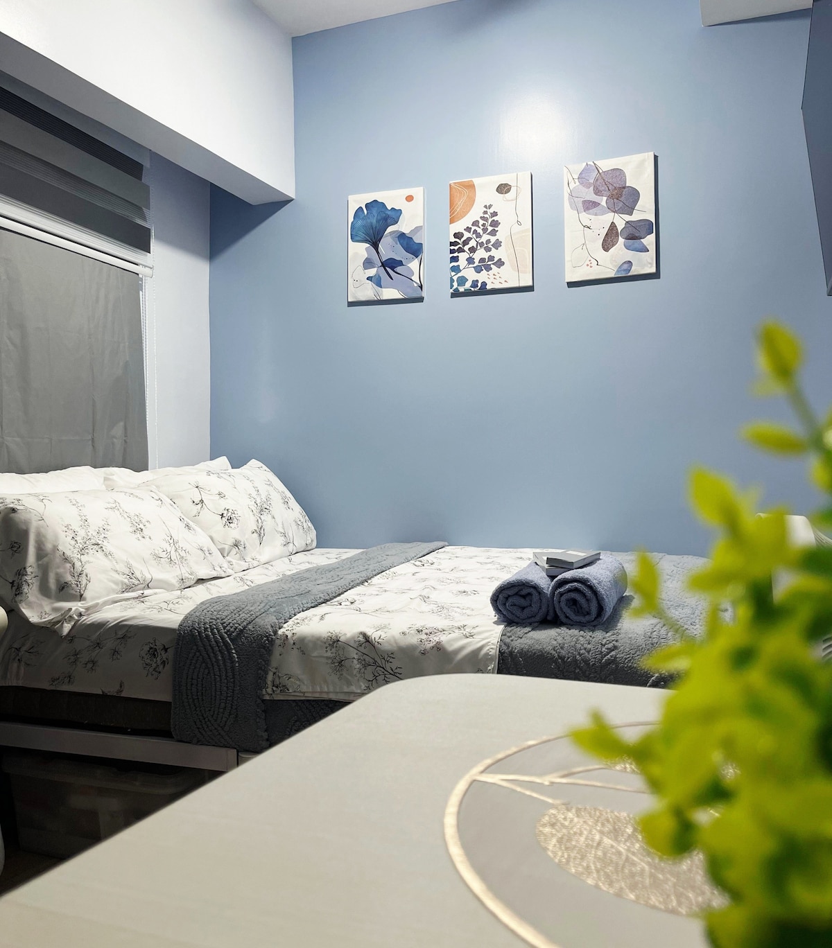 BSA Twin Towers across Megamall 1 BR unit with parking space Self check in 1 King bed 2 Sofabeds LED light fixtures all dimmable Split type AC unit Multi point water heater Rainfall showerhead, bidet, touch illuminated mirrors Vanity table with mirror Fiber internet 5G postpaid Ceiling mounted TV rotates; Netflix, YouTube, local Reading materials; comics Full kitchen, fridge, microwave, induction cooker, rice cooker, water kettle, coffee maker utensils Pools, gym, playroom