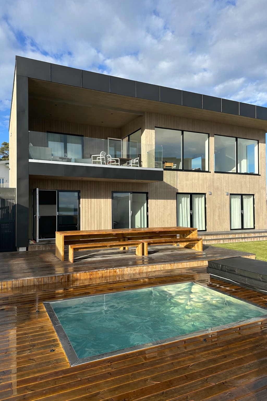 Ta med hela familjen, vänner eller kollegor till detta nybyggda och moderna hus med pool/spabad, beläget nära havet. Boendet ligger en kort promenad från närmaste badplats och vackra promenadstigar längs vattnet. Huset erbjuder en härlig balkong under tak på andra våningen, en terrass på marknivå samt en gräsmatta. Med sina generösa 190 kvm rymmer huset två kök, två vardagsrum, fyra rymliga sovrum samt tre badrum med toalett och dusch. För större sällskap eller fler kan huset enkelt delas upp.