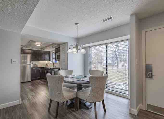 Forget your worries in this spacious and serene space that is only 7 minutes from the hospital, shopping, restaurants, public golf course, laser tag, and mini golf, 10 minutes to Supersplash USA waterpark. 2 bedrooms, 2 bathrooms, sofa sleeper in living room, beautiful open design kitchen, dining, and living room. Washer/dryer, lake waterfront and swimming pool view from master bedroom as well as the private deck.