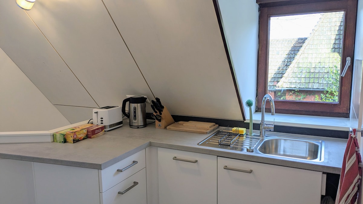 Edinstveno in elegantno svetlo stanovanje v mansardnem slogu na konjski kmetiji. Apartma za goste ima 80 m2 z odprtim dnevnim prostorom in jedilnico, 2 spalnici z visokimi stropi, veliko kopalnico z okni in teraso. Stanovanje se nahaja v Leuchtenburgu v bližini železniške postaje Bremen-Lesum. Vožnja do središča mesta Bremen traja približno 15 minut vožnje z avtomobilom. V bližini so zelo dobri nakupi in čudoviti sprehodi v rekreacijskem območju.