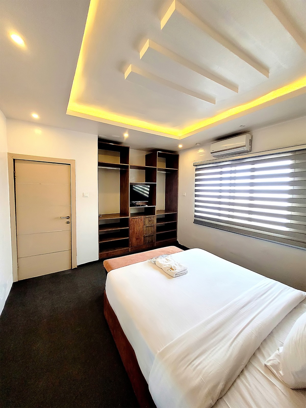 A one bedroom, bathroom and living room apartment with a blend of Afrocentric and modern contemporary wood designs. In house spa- a sauna, steamer and massage rooms-, in house restaurant, gym and coffee lounge, outdoor pool with a poolside Pergola, 24/7 power, security and cctv. It’s ideal for both long and short stays with a minimum of three days located five minutes drive from the international airport and twelve minutes drive from the domestic airport. Airport pickup and dropoffavailable