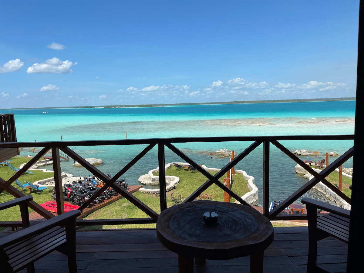 Bienvenido a nuestro paraiso en Bacalar, ubicado a la orilla de la laguna. nuestras suites y bungalows a pie de laguna ofrecen impresionantes vistas de la laguna,una motocicleta incluida en tu estadia , emprende una aventura para descubrir en pueblo magico de Bacalar y relajarte en nuestro jardín. Comienza tus días con nuestro desayuno incluido antes de sumergirte en una aventura acuática con nuestros kayaks y paddle incluidos. Bienvenido al paraíso donde disfrutara cada momento