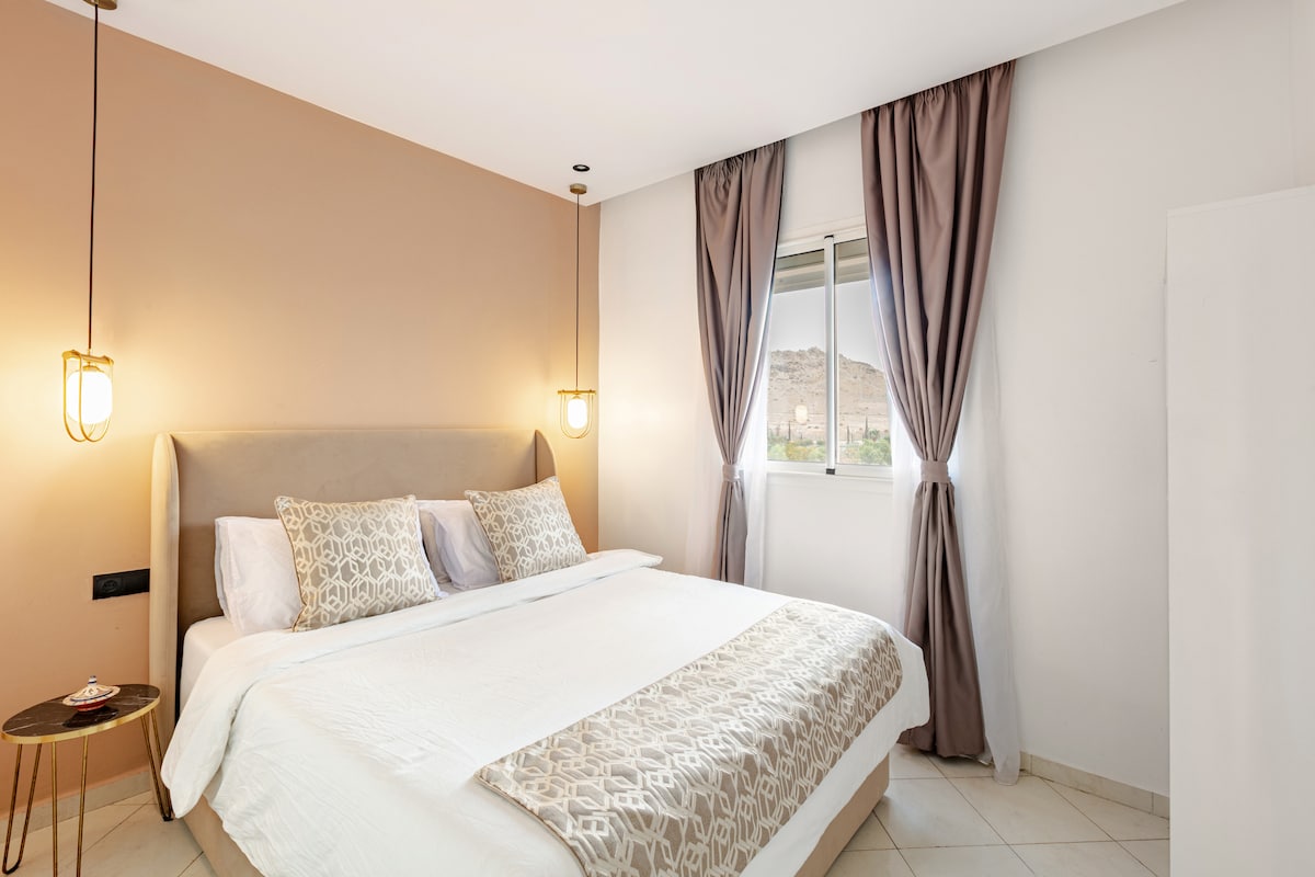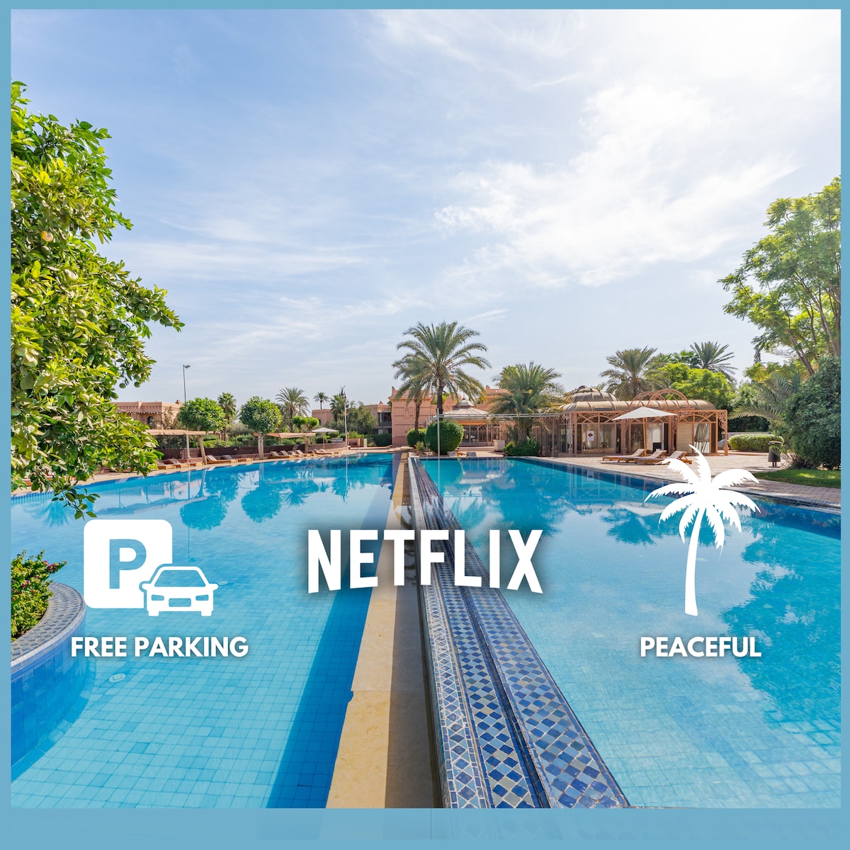 Vivez l'élégance avec la touche marocaine dans l'endroit luxueux de Marrakech ( La palmeraie). Entourés des palmiers , vous profitez : - Canapé moderne convertible en lit deux double - Chambre élégante avec matelas haut de gamme - TV Smart Wifi, Netflix et IPTV - Cuisine entièrement équipée - Grande Salle de bain - Terrasse vue panoramique pour profiter des petits déjeuner et vos pauses. La résidence offre une très grande piscine, grand jardin et un parking gratuit sur place