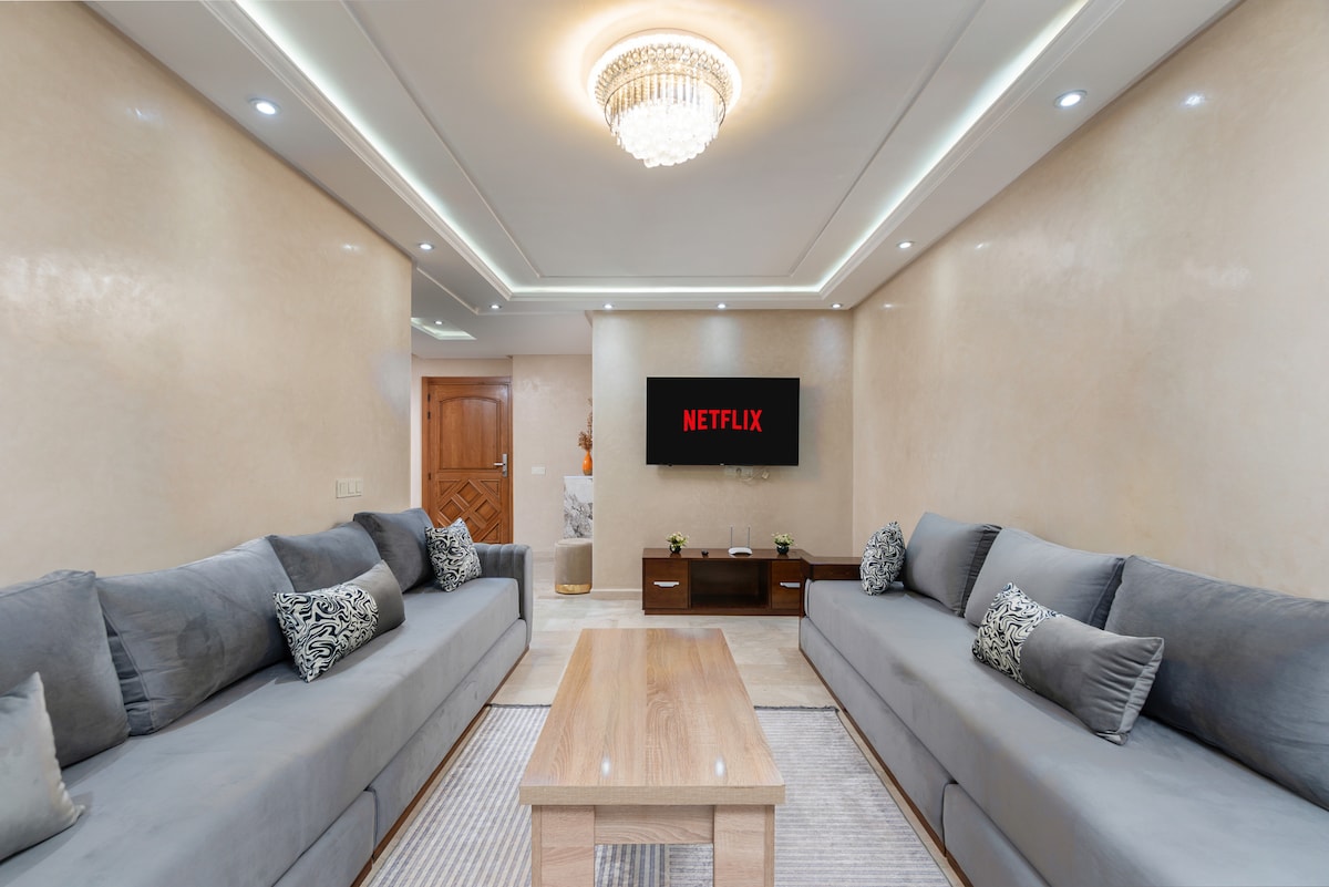 Un appartement luxueux au cœur d'Agadir bay (La sonaba Founty) Résidence familiale À 3 min de la Corniche et la plage d’agadir/ À quelques pas des meilleurs restaurants et cafés À proximité des superettes et super marché Marjane À 5 min de Souk Elhed Une belle Piscine (non chauffée) Parking gratuit Netflix| Wifi rapide | Climatisation centrale Pack de bienvenue offert Parfait pour 1 à 5 voyageurs – vacances ou télétravail. Réservez votre logement dans le quartier prestigieux d'Agadir