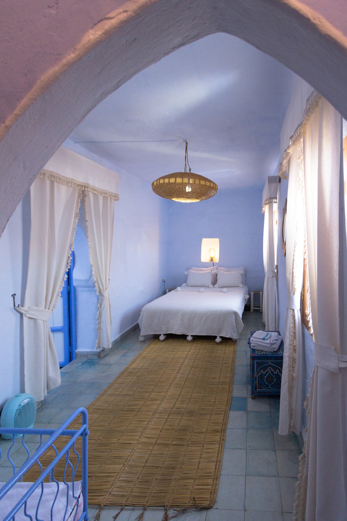 Obrtniško prenočišče v Hay Andalous (stara medina). Udobno prenočišče v 400 let stari zgodovinski stavbi z zasebnim vhodom in prostorno dnevno sobo s panoramskim razgledom na Chefchaouen. Dostop do zasebne strehe za 360-stopinjski pogled na mesto in gore. Enostaven dostop z avtomobilom/taksijem, saj se hiša nahaja ob enem od starih mestnih vrat (Bab Mahrouk) z javnim parkirnim mestom. V podrobnosti je vneseno veliko ljubezni z ročno poslikanim stropom, ročno izdelanim zellijem in tradicionalnimi modrimi stenami (v slogu Chefchaouena).
