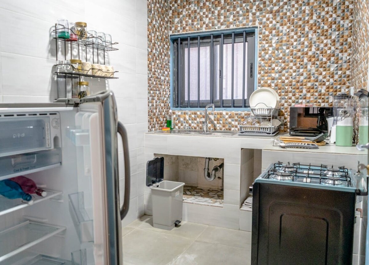 Dobrodošli v tem sodobnem in prostornem garsonjeri v Cotonouju - vašem popolnem domu daleč od doma v mirni in varni soseski. Uživajte v popolnoma opremljeni kuhinji, udobnem dnevnem prostoru z udobnimi kavči in pametno televizijo, jedilni mizi ter zasebni spalnici in kopalnici. Prostor je svetel, čist in premišljeno zasnovan za sprostitev ali delo. To čudovito stanovanje je le kratko vožnjo od letališča, blizu vrhunskih restavracij v Haie viveju ter v bližini supermarketov in trgovin