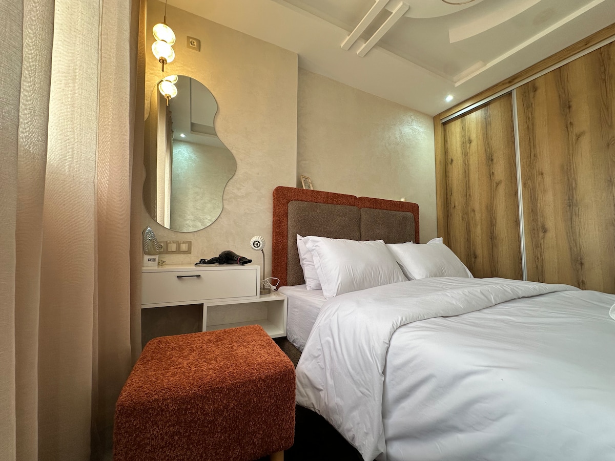 Appartement Élégant avec Terrasse Bienvenue dans ce magnifique appartement alliant modernité et confort, idéalement conçu pour un séjour relaxant. Situé au rez-de-chaussée, ce logement lumineux et spacieux Il se trouve à seulement 5 minutes en voiture de la plage, le centre commercial Carrefour est à 3 minutes à pied Que vous soyez en couple, en famille ou entre amis, cet appartement vous garantit un séjour agréable. Pour les couples marocains, il est important de présenter un acte de mariage.