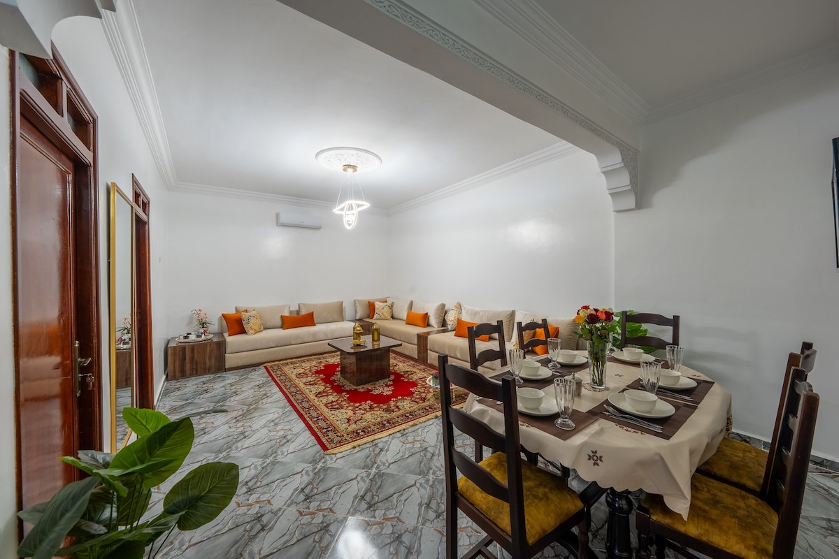 Veliko, nedavno prenovljeno stanovanje v Marakešu, ki se nahaja v 2. nadstropju, le 12 minut od letališča. Ima 2 spalnici, prostorno dnevno sobo in lahko sprejme do 6 oseb. Hitra povezava Wi-Fi, klimatska naprava, ogrevanje, stropni ventilator, pametna televizija, opremljena kuhinja in pralni stroj. Brezplačno parkiranje pred hišo. Idealno za družine, poslovneže in kratka ali daljša bivanja. Odlična vrednost za denar. Nastanitev je v skladu z lokalnimi predpisi.