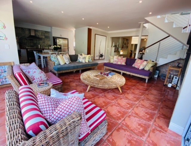Beautiful holiday home with a flat in Kwaaiwater, a quiet suburb in Hermanus. Only 200m from the iconic "Cliff Path". Swimming beaches, Fernkloof hiking trails & golf course are also very close. House: Double story, 5 bedrooms, 4 bathrooms, two living areas, two covered patios, lovely play area (jungle gym) for young kids, uncapped Wifi, no load-shedding. Additional Flat: 1 bedroom, bathroom, kitchen & living area with sleeper sofa. Pet-friendly only by prior approval (deposit required).