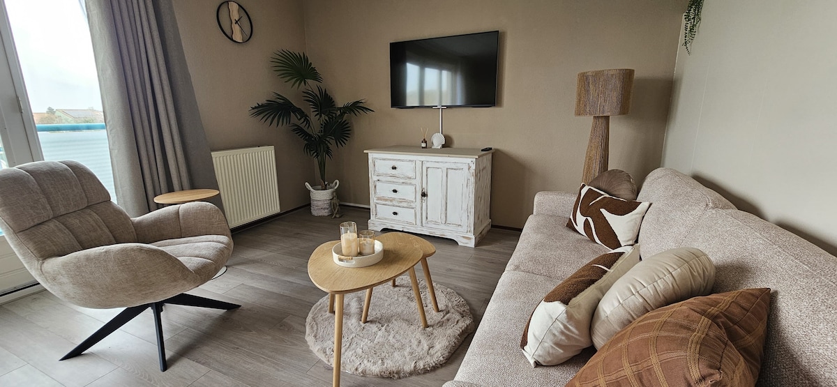 Stanovanje (40 m2) se nahaja tik pred plažo in tik ob sipinah. V svojem stanovanju imate osupljiv razgled na morje. Udobna nastanitev za 2 osebi in je povsem nova, dokončana v juniju 2021. Udobna dnevna soba s televizijo, popolnoma opremljena kuhinja, udobna širša zakonska postelja, popoln WI-FI in dobra kopalnica. Zasebno parkirno mesto je tik ob stanovanju, na voljo pa je tudi zasebna terasa z jedilno mizo in udobnimi plažnimi stoli. Vaš pes je zelo dobrodošel. Dovoljujemo samo enega psa.