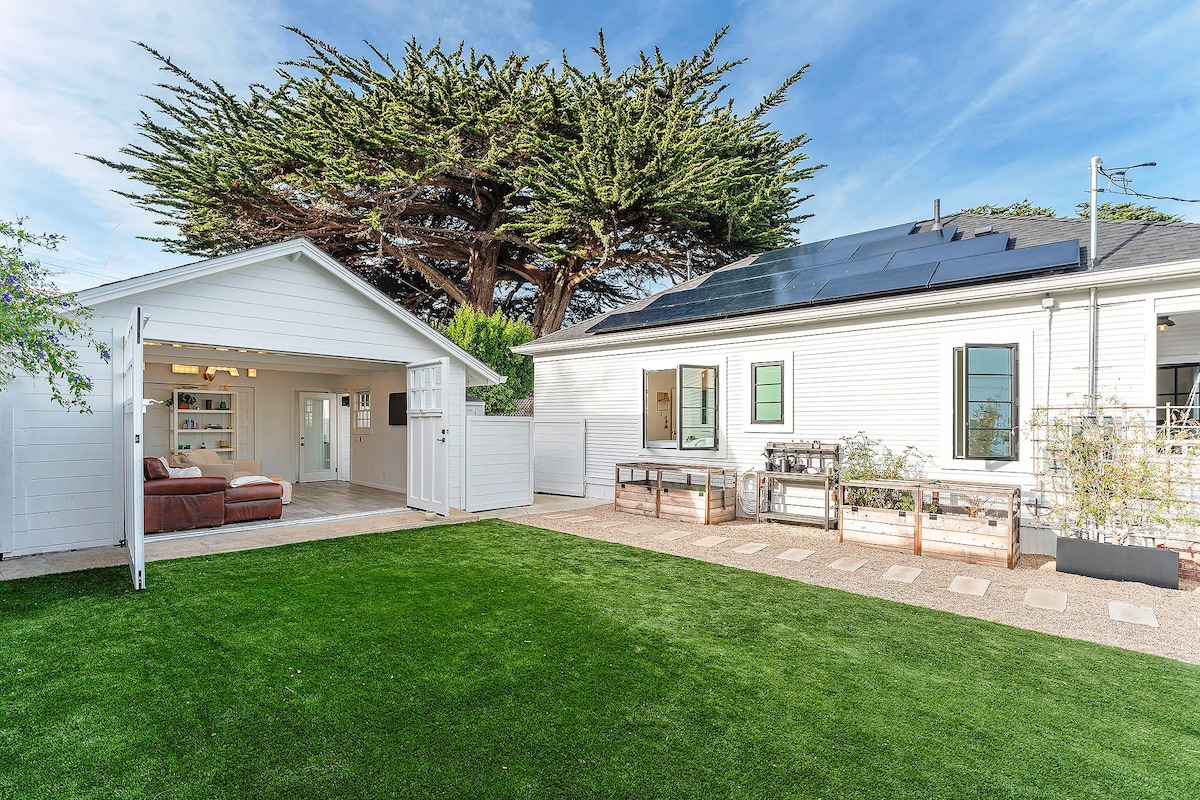 Popolna domača baza za uživanje na polotoku z družino. Nahaja se v mirni enosmerni ulici. Parkirajte na zasebnem ograjenem dovozu. Ulica navzdol do plaže Lovers Point ali do središča mesta P.G. Sprehodite se po obmorski kolesarski/sprehajalni poti neposredno do akvarija Monterey Bay. Prenočišče je v celoti obnovljen bungalov na plaži iz leta 1930 s klasično rokodelsko arhitekturo in visokimi stropi. Obedujte, medtem ko uživate v pogledu na ocean iz sončne sobe. Zunaj terase in vrta dobite odlično sončno svetlobo. PACIFIC GROVE, dovoljenje za kratkotrajni zakup #0463