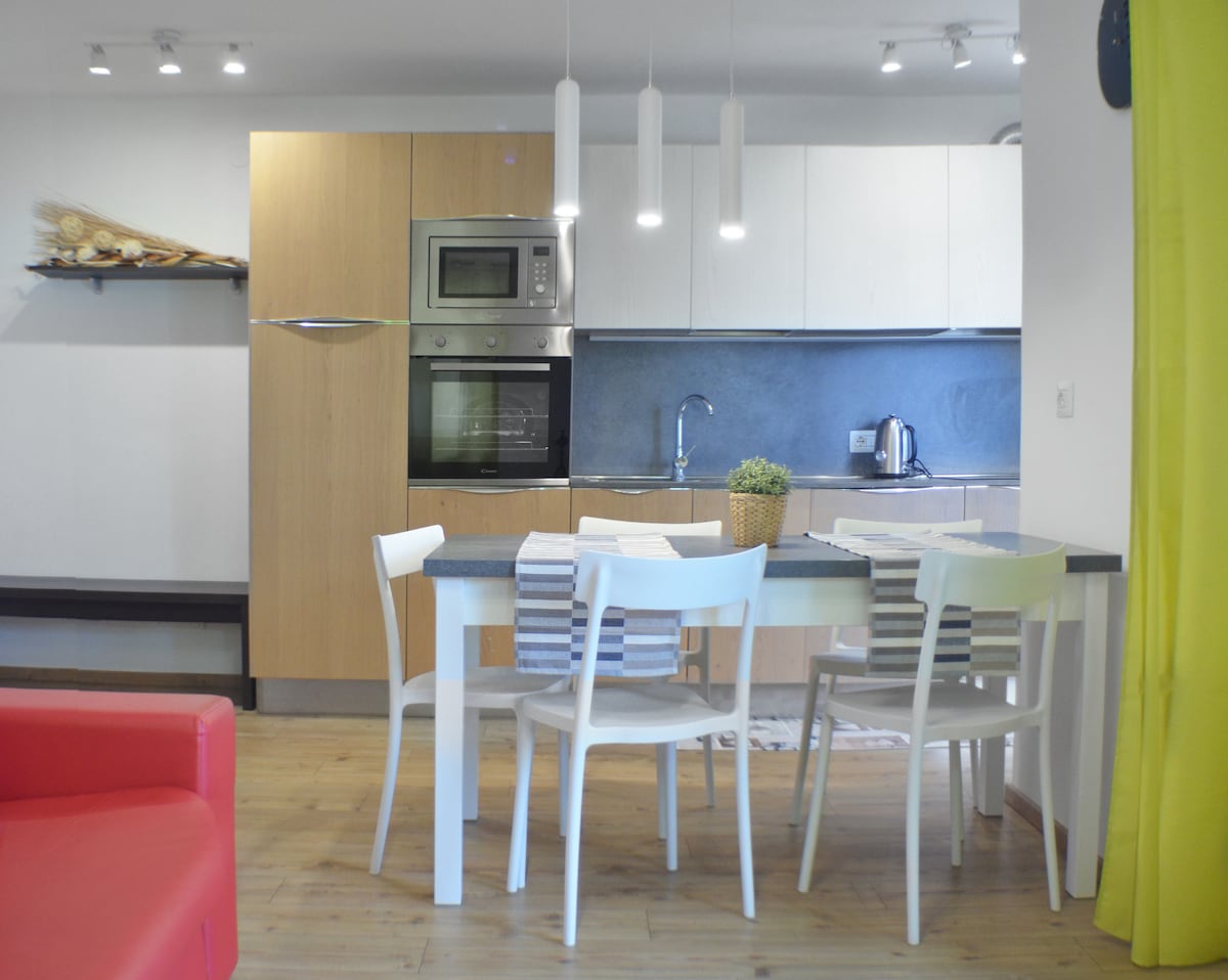 Podstrešno stanovanje je skoraj v celoti prekrito s starinskim lesom in opremljeno na tradicionalen način, opremljeno z dnevnim prostorom z velikim raztegljivim kavčem in pametno televizijo, jedilno mizo, kuhinjo, opremljeno z vsemi glavnimi napravami, vključno s pečico in pomivalnim strojem. Prednosti stanovanja so prostorni balkon, obrnjen proti vzhodu, s pogledom na Santa Maddaleno, kjer lahko uživate v jutranjem soncu ob čudovitem zajtrku in popolnoma novi zasebni savni iz borovega lesa.