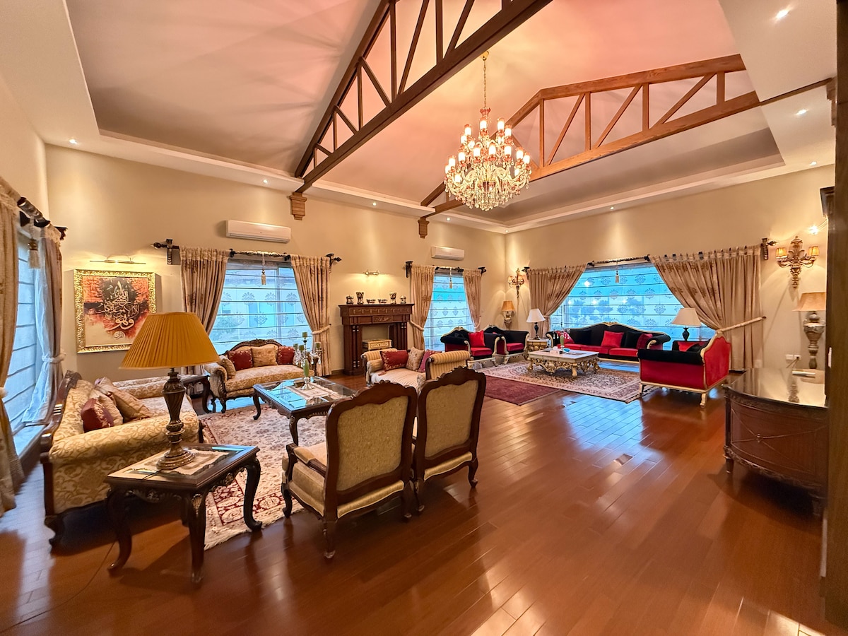 Pobegnite v to 6-sobno vilo v 7. fazi DHA, ki sprejme do 18 gostov. Uživajte v elegantni notranjosti, 2 jedilnici, dvorani za prireditve, telovadnici, Q-LED-jih in zunanjem vrtu z žarom (prednaročeno). Neobvezne storitve vključujejo kuharja, voznika, vodene zgodovinske oglede in najeme vozil. Le 5 minut od jedilnega središča DHA Raya in 10 minut od letališča je kot nalašč za družinske počitnice, poroke ali umike. Skrbniki zagotavljajo brezhibno bivanje. Vaše sanjske počitnice vas čakajo – rezervirajte zdaj!