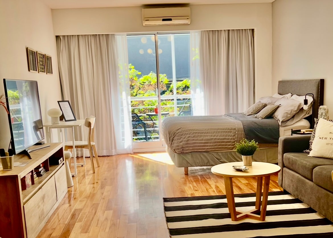 Popolnoma novo studio stanovanje s polno kuhinjo, kopalnico in balkonom s čudovitim razgledom v osrčju Palermo Hollywooda. Polno naravne svetlobe! Sodobna dekoracija, popolnoma opremljena in varna. SmartTV s kabelsko televizijo in Netflixom (prijavite se s svojim računom). Stavba ponuja odlično opremo: ogrevan notranji bazen, zunanji bazen s solarijem, spa z masažno sobo in savno, telovadnico, terase za sprostitev, sejno sobo in prostor za peko na žaru. Do najboljših restavracij, barov, kavarn in javnega prevoza se lahko sprehodite peš.