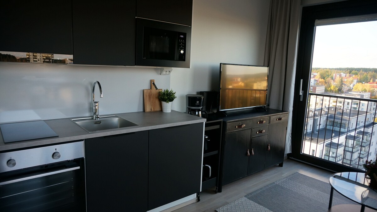 Tässä valoisassa ja neliöitään isomman tuntuisessa kulmahuoneistossa ikkunat sijaitsevat kahdella eri seinällä, joten lattiasta kattoon olevista isoista ikkunoista ja ranskalaiselta liukuoviparvekkeelta avautuvat mahtavat näköalat yli Nokian. Tähän asuntoon pääsee myös pidemmäksi aikaa. Brand new furnished studio in the city center of Nokia. From the top floor, this apartment offers an amazing view across the town. The apartment can accommodate 1-2 guests.