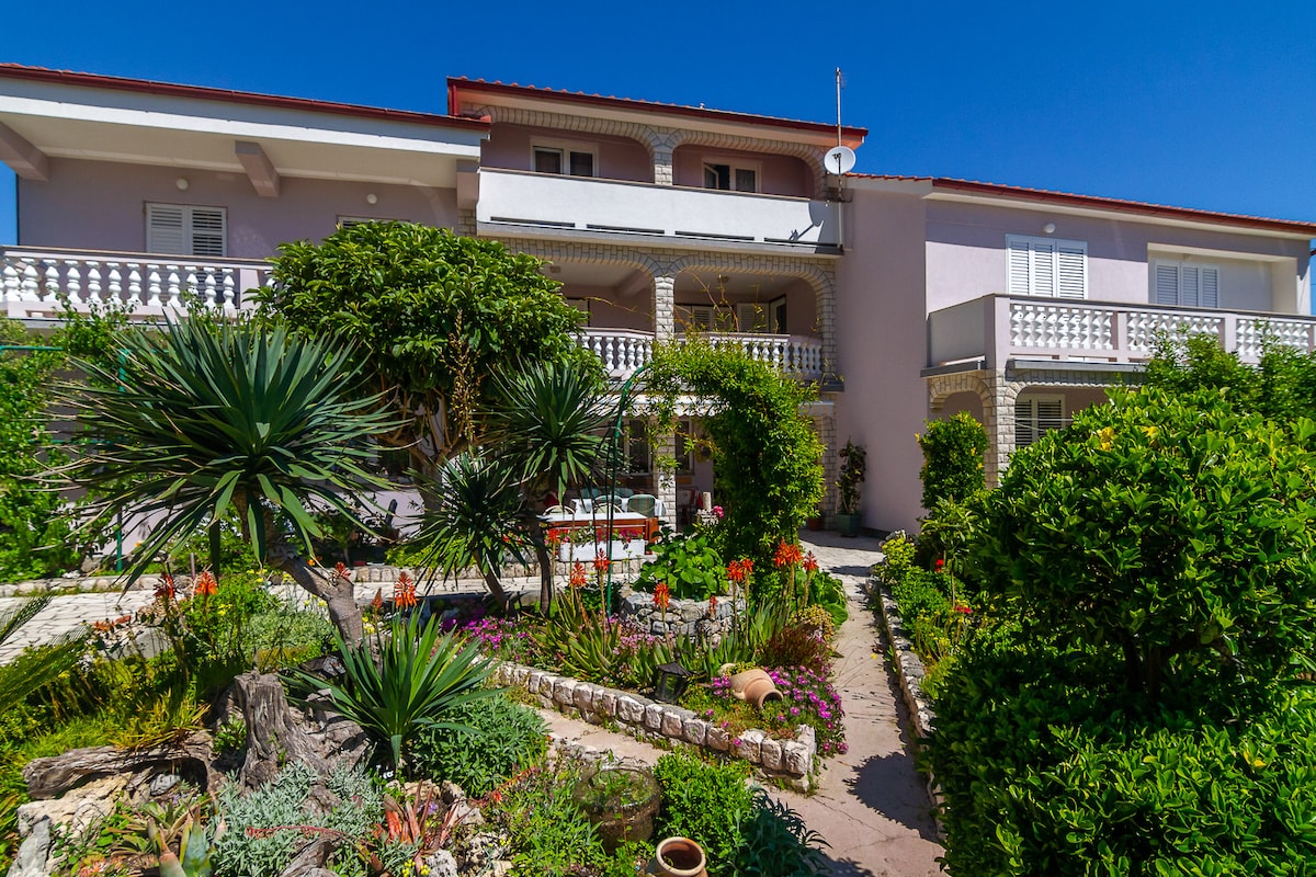 Udobno, odlično štirisobno stanovanje, dve kopalnici, dve prostorni terasi, klimatska naprava, Wi-Fi, TV satelit, žar, parkirišče, travnik, domače palačinke, prijazni gostitelji... 1 km od morskega promenada. Bodite odlična rešitev za kolesarsko skupino 10 oseb. Še posebej zgodaj spomladi in jeseni,ko je narava na otoku več kot lepa. Opomba: hiša se nahaja ob glavni cesti, zato razmislite o tem, da si ogledate druge namestitve, če iščete zabaven/tihi spanec. 🙏🏼
