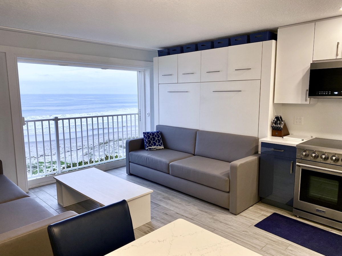 Steps from the sand! Upscale and spacious 1 bedroom, 1 bath suite. Breathtaking ocean views from every angle including triple glass slider, balcony, and oversized bedroom windows! See and feel rocket launches from the private balcony. Perfect for aquatic adventurers or close-knit friends. Tastefully appointed and newly renovated, expect an idyllic location for on-the-water fun with luxury for up to 4 guests Near Disney/Orlando Airport, Kennedy Space Center, Port Canaveral, Cocoa,Melbourne