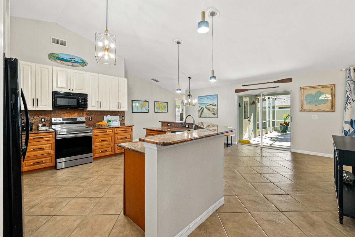 *SODOBEN*ODPRT* BAZEN Z OGREVANO SLANO VODO *BLIZU PLAŽE*OGRAJENO NA DVORIŠČU*PES Nahaja se na območju Palm Harborja, v bližini plaže,nakupovanja in restavracij. Vabimo vas v našem novem prenočišču v Palm Coastu. VSE je novo in višje kakovosti. To prenočišče smo opremili in založili, saj je bilo to celoletno primarno prenočišče. Ta kuhinja ima čudovite omare, granitne pulte, nove aplikacije iz nerjavečega jekla, tla s ploščicami, okenske tretmaje iz bambusa, kamnite prhe, veliko prostora v omari