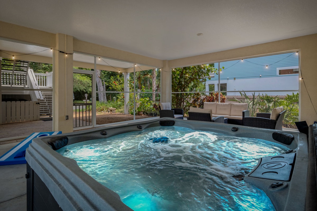ISLAND RETREAT - resnično edinstveno zasebno doživetje na prostem! ✔ 3 udobne spalnice (dodatna 4. zasebna spalnica) in 2 kopalnici ✔ Sončni ogrevani bazen in popolnoma nova masažna kad ✔ Tiki bar s TV, igre na dvorišču in žar ✔ Ognjišče ✔ Super blizu dostopne točke New Beach (0,25 milj) ✔ Kratka vožnja do središča St. Augustine (15 min) ✔ Otroška soba za igre in zabavo ✔ Opremljen s 5 televizorji in hitrim internetom