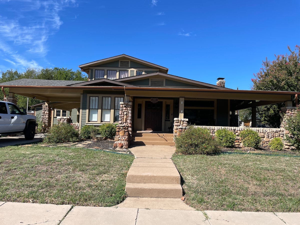 Enjoy a beautiful, modernized craftsman home centrally-located. This gorgeous Master Craftsmen is elegant and family friendly. Great location, three blocks (5 min walk) from downtown Mineral Wells shopping, restaurants & the Crazy Water Hotel. Two blocks from original Crazy Water Well . A spacious home with an open layout, large covered front porch, & detached game room with pool table, games, and large TV. Bedrooms include Two King beds, a queen, & a single. Playground for the kids.